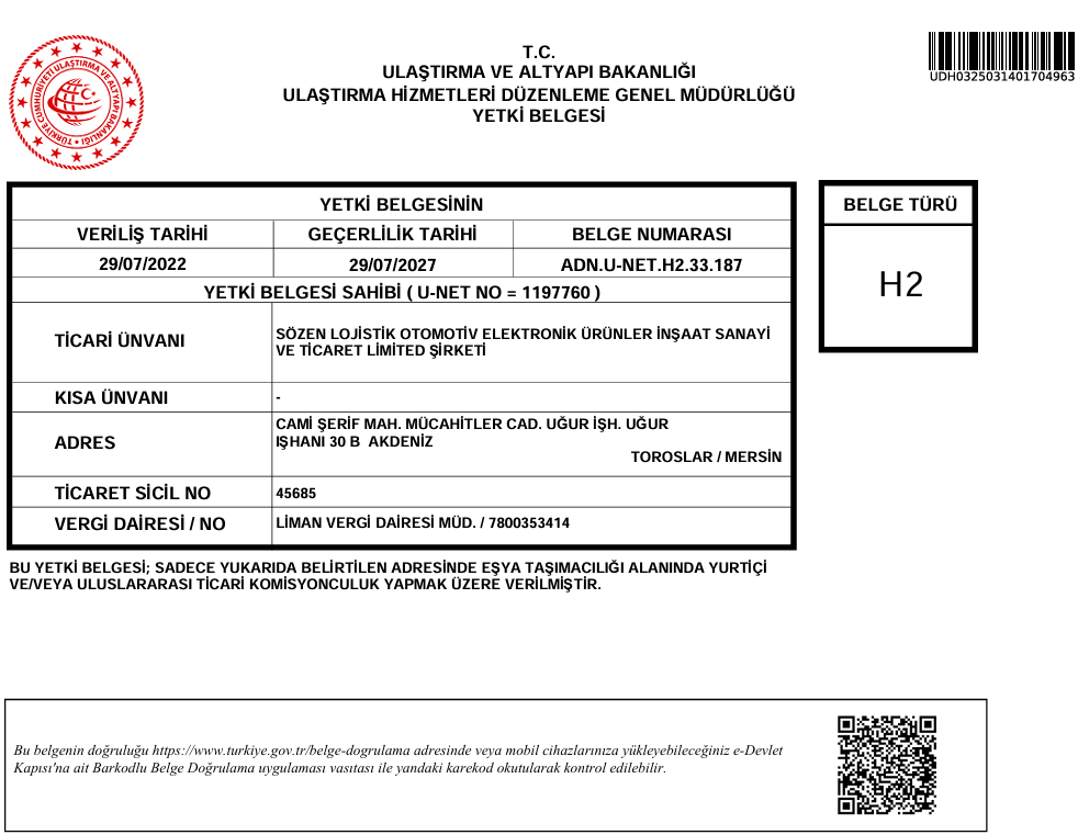 H2 Yetki Belgesi | Sözen Lojistik Mersin